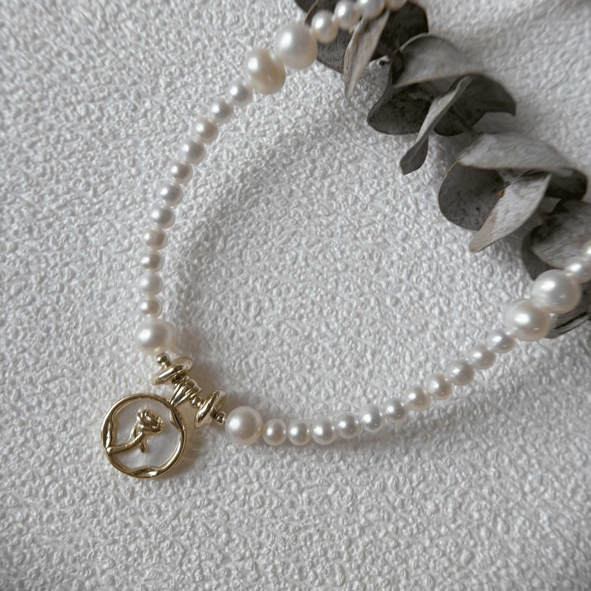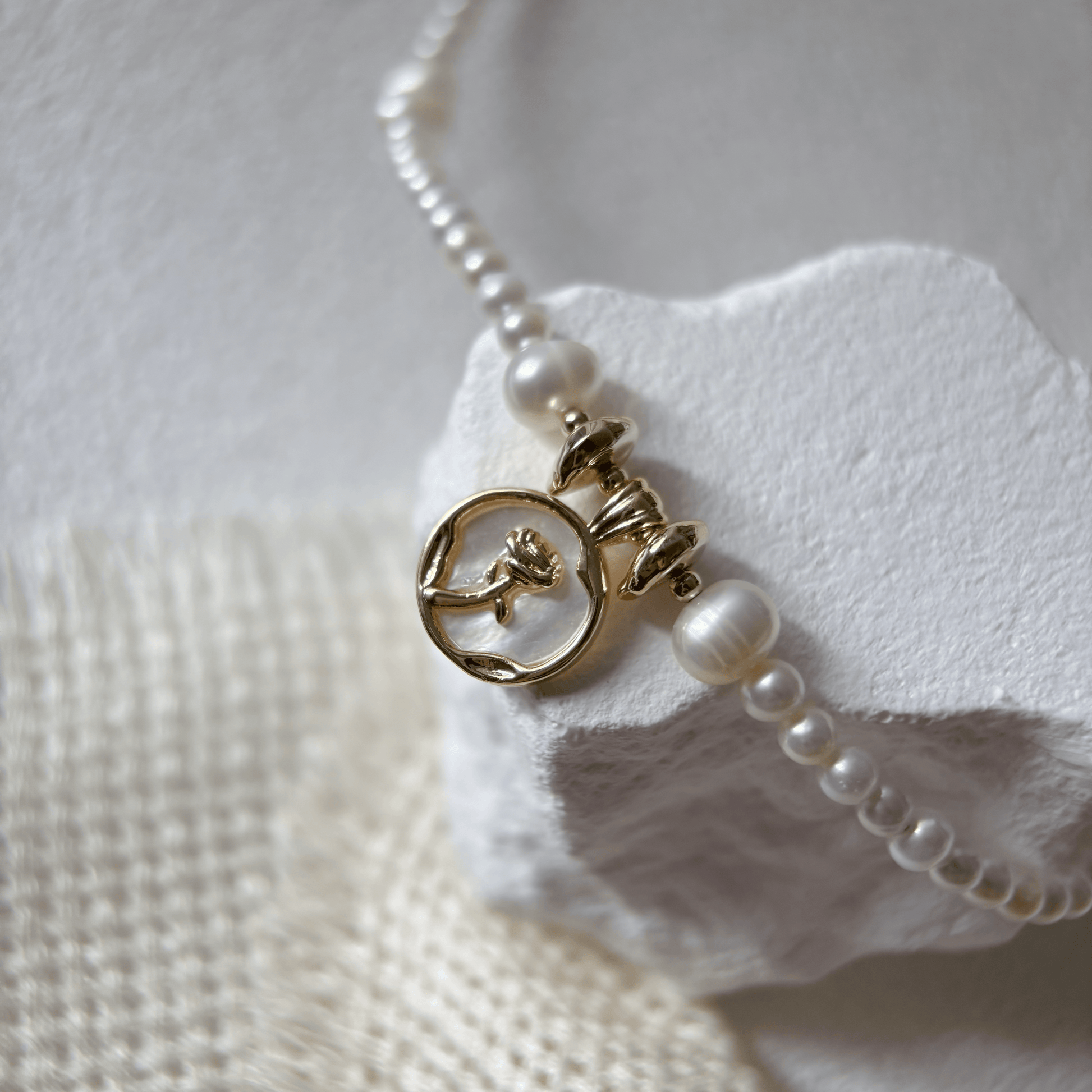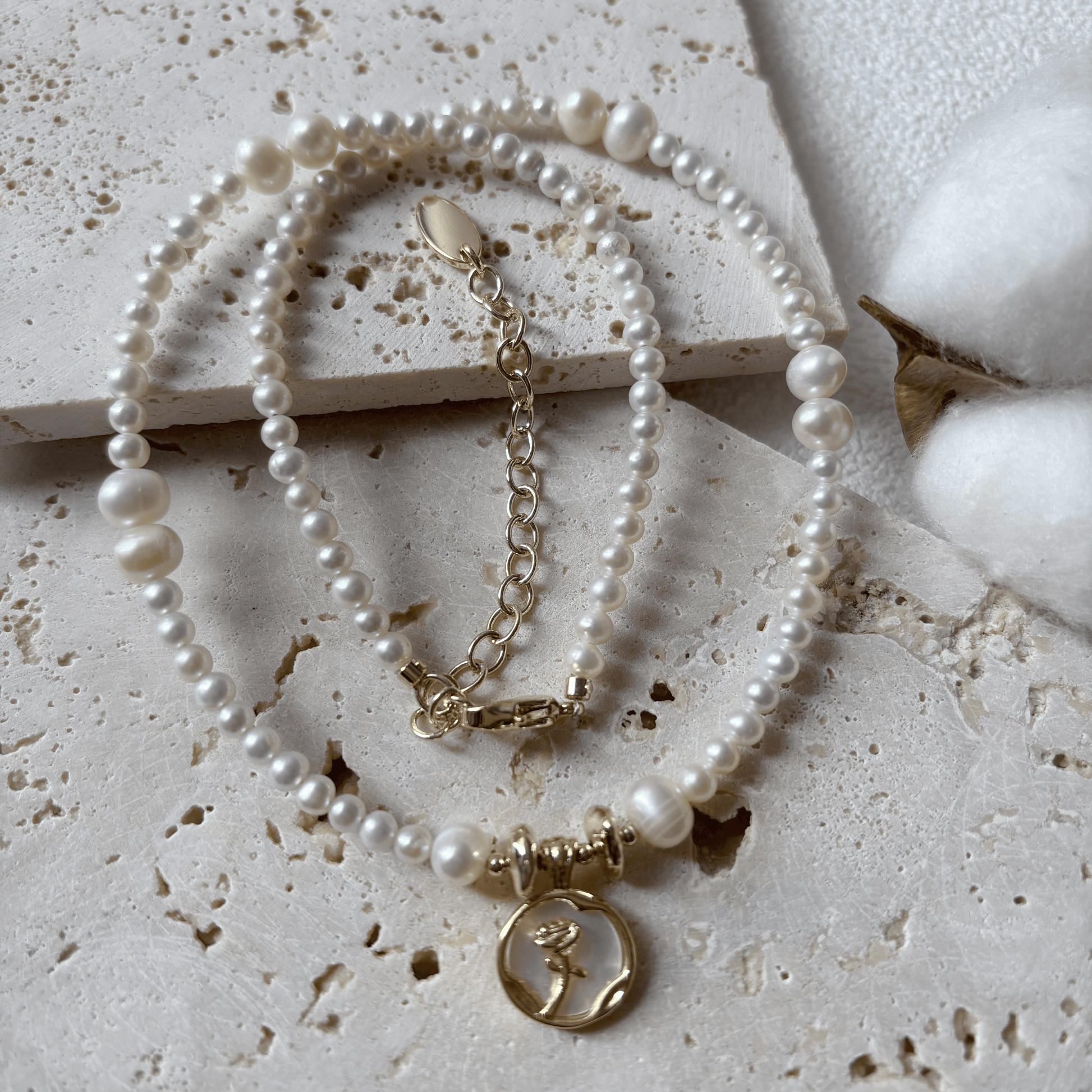 Material: Freshwater pearls, natural shells and copper.