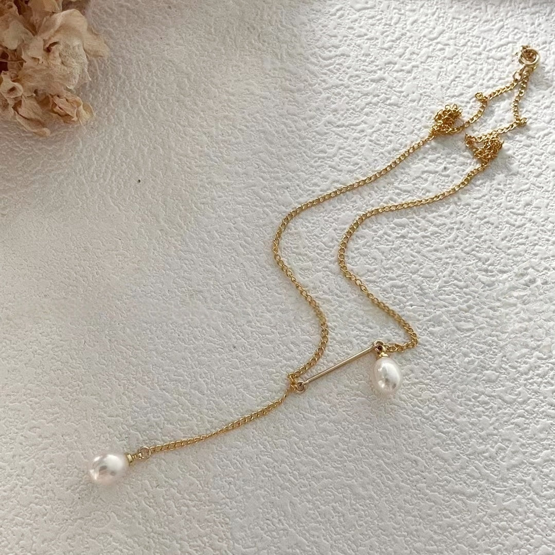 「 Eternal Stare 」Asymmetrical Double Pearl Dangle Necklace
